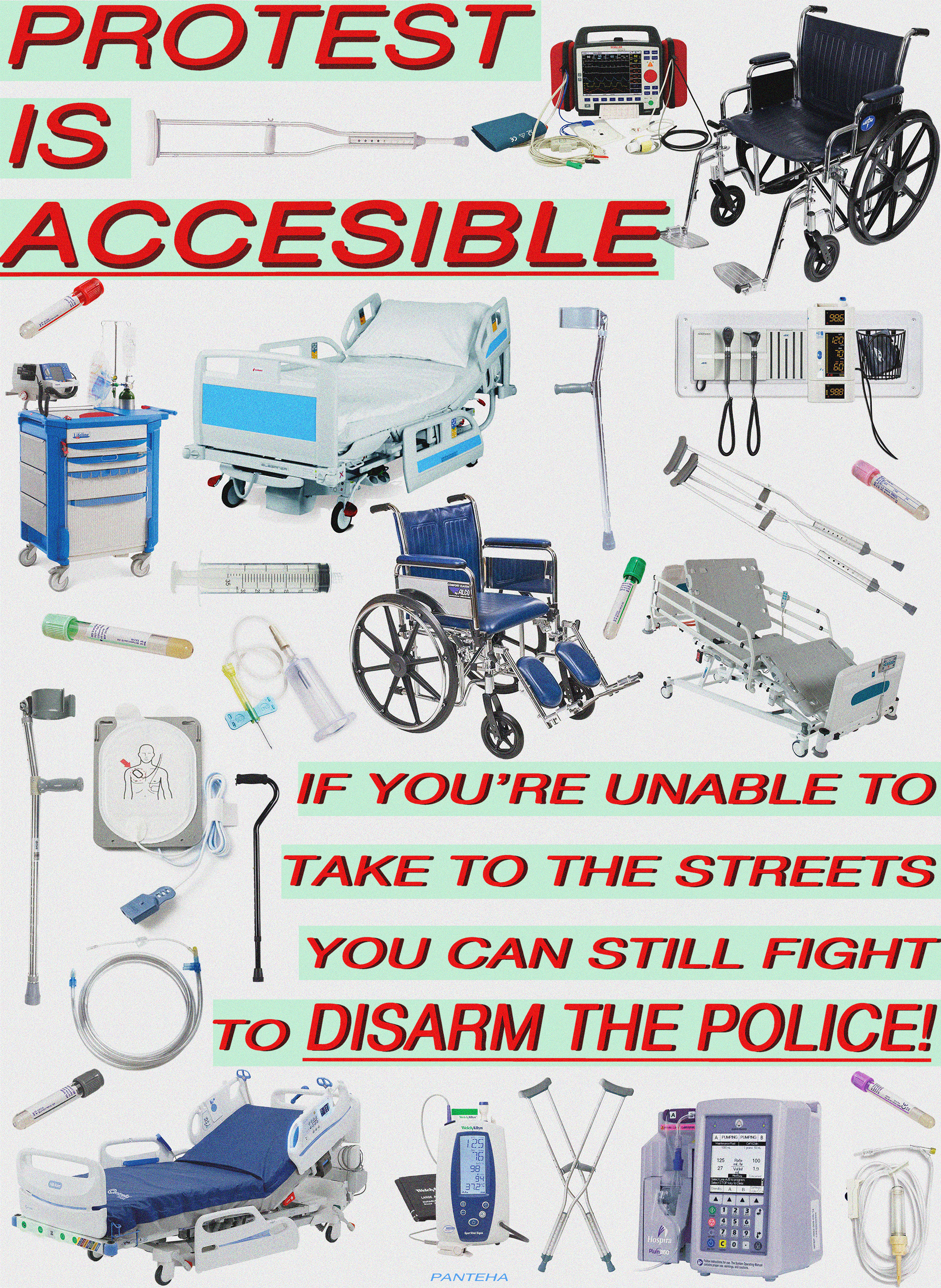 “Living with a disability and chronic illness, I quickly realized many years ago that the widespread notion of "protest” is one that involves activity and access that might be difficult or impossible for the sick and disabled. It can feel isolating and hopeless to be unable to participate in walks and physical protests, but this piece is to remind both the able-bodied and the sick/disabled that the act of protest is not strictly physical. There is much that can be done from anywhere, placing calls, emailing representatives, and (if possible) donating to bail funds, BLM, and other groups. PROTEST IS ACCESSIBLE, this must not be forgotten!“ - Panteha Abareshi